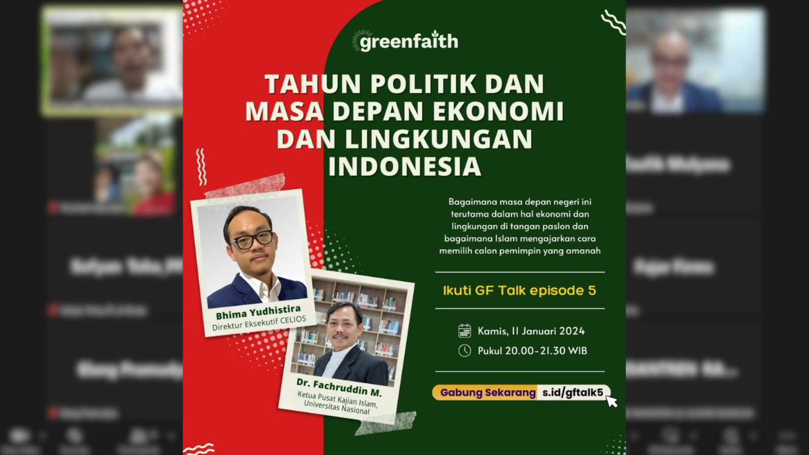 Islam mengajarkan kita untuk bertanggungjawab secara individu dalam mengelola sumber daya alam, termasuk memilih pemimpin yang akan memimpin negara dalam mengelolanya. GreenFaith Indonesia kembali mengadakan diskusi GreenFaith Talk yang memasuki episode kelima dengan tema “Tahun Pemilu dan Masa Depan Ekonomi dan Lingkungan Indonesia,” Kamis, 11 Januari 2024. Dalam pembukaan diskusi, Koordinator GreenFaith Indonesia, Hening Parlan mengatakan “meski laporan dari lapangan menunjukkan besarnya kerusakan alam yang terjadi tapi kita juga harus menaruh harapan pada pemimpin di semua lini. Tapi GreenFaith juga mengajak umat bersikap kritis pada calon pemimpin yang akan dipilih, harus memiliki pertimbangan keadilan ekonomi dan lingkungan agar mampu mewujudkan keadilan dan kesejahteraan dari sumber daya yang ada.”