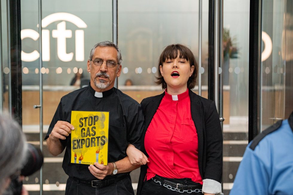 On July 30, 2024, twenty-three courageous clergy and faith activists were arrested at Citibank for blocking or chaining themselves to the doors of the bank’s headquarters in a prayerful demonstration. Several clergy and lay leaders spoke at pulpits at Citi’s entrance, urging the bank to enact just and loving climate policies. This action brought together 50 people from diverse faiths and was covered by Earthbeat (National Catholic Reporter) and Common Dreams.